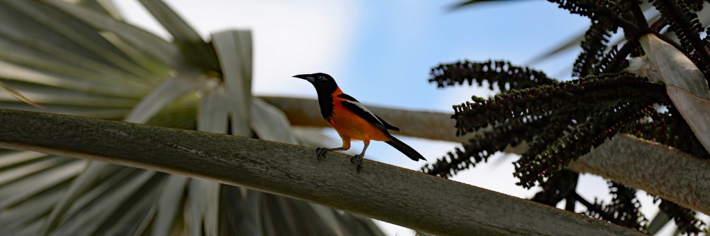 The Trupial, a troubadour between songs, a splash of orange in the Bismark Palm, and one of our regular morning visitors.