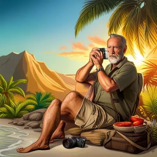 In my former life, I used a picture of typewriter for my image on the Founder’s page of my workaday commercial website. Here, at least for the time being, I’ll beg your indulgence and your craft. Imagine yourself to be more creative than any AI bot, and stitch together, in the manner of some Antillean Mister Doctor Frankenstein, a rendering from this prompt: biological male, Caucasian but sun-browned, past fifty years of age, balding, gray bearded, fit from hiking and swimming yet paunchy from rum cocktails, wearing cargo shorts, flipflops, and a gaudy Tiki shirt, carrying a Canon.